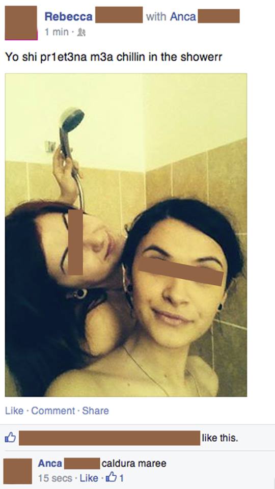 Goale, una în spatele celeilalte, cu duşul deasupra capului, piţipoancele au făcut senzaţie în mediul virtual. Au stârnit amuzamentul internauţilor prin ipostaza penibilă în care s-au pozat. Pensate ca două piţipoance veritabile, cu zâmbetul pe buze, fetele par a se simţi în elementul lor.