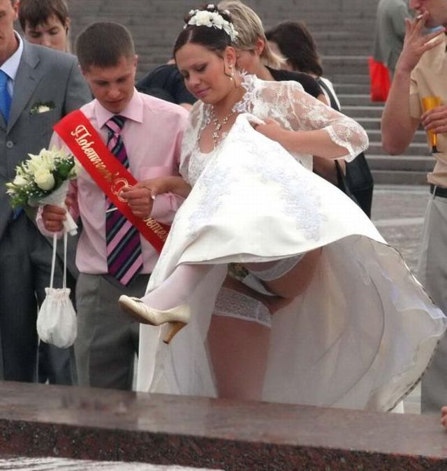 Mireasa din imagine a devenit subiect de batjocură pe Internet, după ce a fost surprinsă într-o ipostază cu adevărat penibilă la propria nuntă. Zâmbitoare, cochetă şi extrem de nărăbdătoare să facă poze, aceasta a uitat un detaliu important şi s-a făcut de râs. În timp ce toată lumea o privea, miresica şi-a ridicat rochia, a făcut pasul mare, într-o încercare eşuată de a trece o bordură, şi a arătat tuturor ceea ce doar mirele trebuia să vadă.