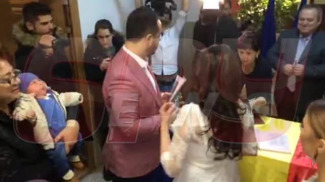 La ieșirea din casa de căsătorii, Claudia și Gabi, după ce au fost ”bombardați”, conform tradiției, cuy orez și au trecut pe sub arcada de flori, și-au luat băiețelul în brațe care devenise deja neliniștit din cauza absenței părinților săi. Cum a ajuns în brațele mamei, Gabriel Alexandru, micuțul care urmează să fie creștinat din moment în moment, s-a liniștit imediat, motiv pentru care artista a putut sta și ea la fotografiile de grup făcute chiar în fața Stării Civile.