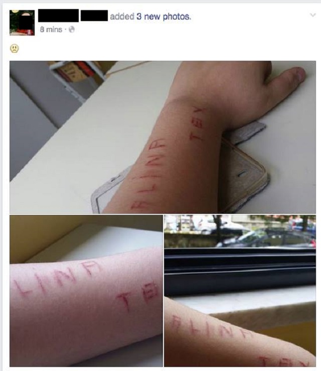 Băiatul, căruia îi vom păstra anonimatul, din motive lesne de înţeles, a postat pe pagina sa de Fcebook mai multe imagini cutremurătoare, în care îşi etalează braţul stâng mutilat cu lama de bărbierit. Decepţionat în dragoste, minorul a decis să "marcheze evenimentul" aşa cum a crezut el de cuviinţă: a crestat cu lama, pe propria piele, numele fetei iubite.
