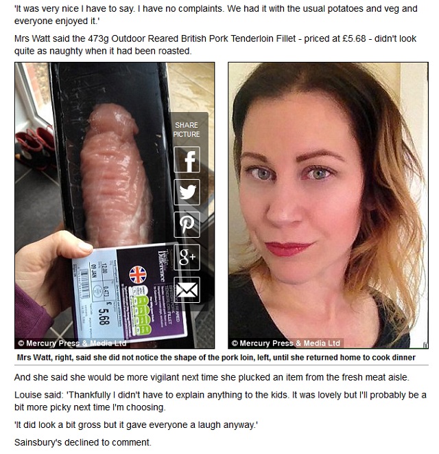 "Atunci când faci cumpărături cu un copil de 6 ani şi cu unul de doi, nu vrei decât să intri şi să ieşi cât mai repede din supermarket. M-am uitat ca să văd dacă nu este expirat, însă nu mi-am dat seama de forma lui. L-am luat şi l-am congelat din nou şi am izbucnit în râs. Este într-adevăr obraznic", a declarat Louise Watt pentru dailymail.co.uk.