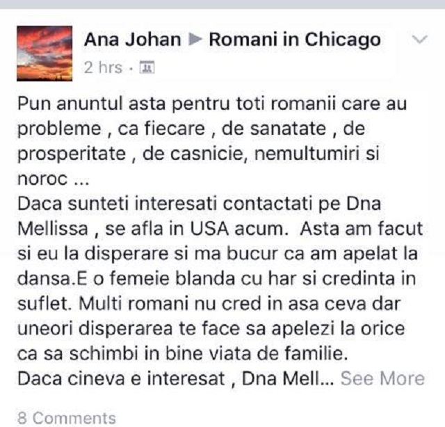 "Pun anunţul ăsta pentru toţi românii care au probleme (...) de sănătate, de prosperitate, de căsnicie, nemulţumiri şi noroc... Dacă sunteţi interesaţi, contactaţi pe doamna Melissa, se află în USA acum", explică o "fostă clientă mulţumită", ataşând şi numărul de telefon al "tămăduitoarei".