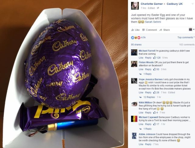 Tânăra a postat pe o reţea de socializare o fotografie cu o cutie în care se află un ou de ciocolată. Fata a spus că abia ce au despachetat cadourile şi nu mică i-a fost surpriza atunci când a văzut că în interiorul cutii în care se afla oul de ciocolată primit de verişorul ei Ollie, în vârstă de 4 ani, se află o pereche de ochelari de vedere.