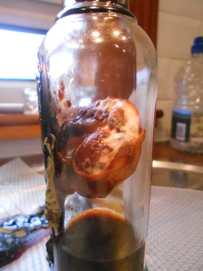 Atunci când oțetul a fermentat, s-a format un fel de ciupercă, formată din celuloză și din acidul acetic. Chiar dacă pare o imagine înfricoșătoare, ciuperca nu afectează oțetul, așa că nu este nevoie să arunci sticla.