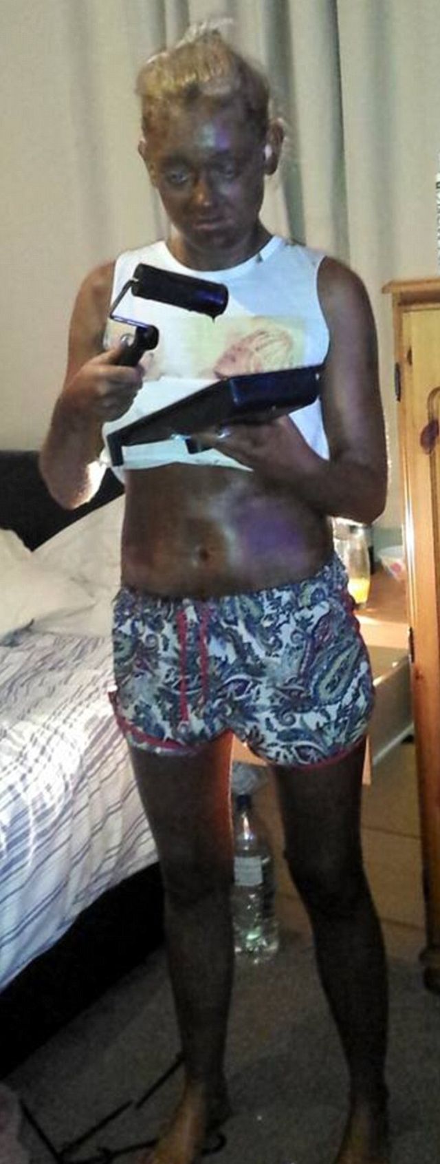 O femeie din Solihull, Anglia, pe nume Imogen Silversides, şi-a vopsit corpul cu un trafalet pentru a crea efectul de piele bronzată, dar rezultatul a fost îngrozitor, potrivit dailymail.co.uk.
