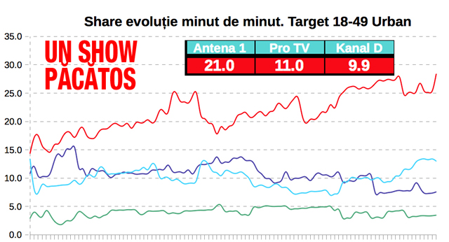 Antena 1 şi-a umilit concurenţa cu ratingurile de ieri-seară. Telespectatorii au fost curioşi să afle ce rezultat a avut Oana Lis la testul de sarcină şi au putut vedea, în direct la "Acces direct", că blonda lui Viorel este gravidă. Oamenii au rămas în faţa televizoarelor şi câteva ore mai târziu, la "Un show păcătos", pentru a afla cum a primit Viorel Lis vestea neaşteptată că va deveni tată. Discuţiile prinse dintre soţii Lis şi detaliile picante din viaţa lor au făcut ca Antena 1 să se claseze mult deasupra ProTV-ului din punct de vedere al rating-ului şi al share-ului. "Acces direct" a avut un rating de 5,1, în timp ce ProTV a atins doar 3,5. Share-ul emisiunii a fost de 35,5, în timp ce emisiunea concurentă de la ProTV a avut un share de doar 17,6. De cealaltă parte, "Un show păcătos" a atins un rating de 3,5, faţă de 1,7 cât a avut emisiunea de la Kanal D. Share-ul "Un show păcătos" a fost de 21,1, faţă de numai 9,9 Kanal D.