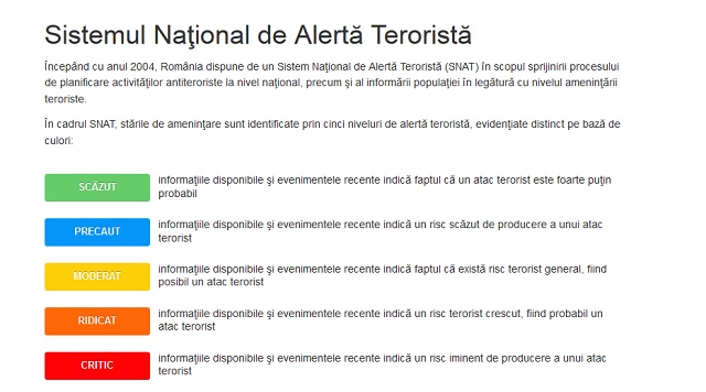 În timp ce întregul continent este în stare de alertă, pe site-ul SRI-ului, Sistemul Naţional de Alertă Terorist este la nivelul precaut, puţin peste cel scăzut. Pe scurt, informaţiile şi evenimentele recente indică faptul că există risc scăzut de producere a unui atac terorist.