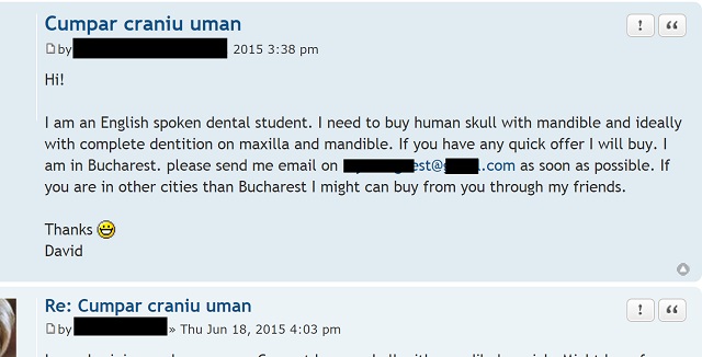 Reporterii SPYNEWS au descoperit pe un forum destinat sudenţilor la Medicină mai multe anunţuri şocante, care ar putea face obiectul unor anchete penale, pentru trafic cu oseminte umane! Fără vreo reţinere, mediciniştii postează anunţuri în care menţionează faptul că sunt dispuşi să plătească sume consistente pentru nişte cranii umane, care ar putea proveni din profanarea unor morminte.