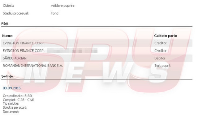 O companie din Panama le-a cerut judecătorilor bucureşteni blocarea tuturor conturilor bancare deţinute de Adrian Sârbu până la recuperarea a nu mai puţin de cinci milioane de euro. Dosarul a fost înscris la Judecătoria Sectorului 1, următorul termen de judecată fiind stabilit pentru începutul lunii septembrie. Omul de afaceri nu este la prima întâlnire cu societatea panameză, companie ce investeşte masiv în afaceri din domeniul mass-media. În urmă cu trei luni, reprezentanţii companiei au obţinut instituirea unui sechestru pe bunurile omului de afaceri.