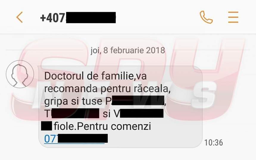 "Doctorul de familie vă recomandă pentru răceală, gripă şi tuse ..., ... şi ... fiole. Pentru comenzi, 07..." - acesta este SMS-ul pe care l-au primit, astăzi, mii de români. Indignaţi, cei mai mulţi au declarat, pe o pagină web, că vor reclama expeditorul, pentru că a apelat la această strategie, lăsând să se înţeleagă faptul că mesajul era transmis de medicul de familie.
