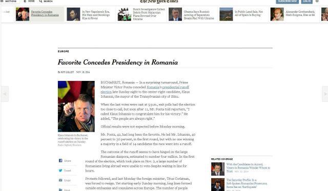 "Prim-ministrul României a fost invins în alegerile prezidenţiale. Românii au sărbătorit victoria lui Klaus Iohannis, care a mers în mijlocul susţinătorilor săi, zâmbind larg şi strângând mâini, în acelaşi loc unde demonstranţii au fost ucişi în timpul revoluţiei din 1989", scrie New York Times.