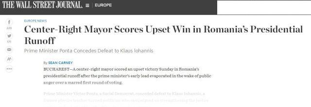 "Klaus Iohannis, un fost profesor de fizică devenit politician, şi-a făcut campanie pe întărirea justiţiei şi reducerea rolului statului în economie, fapt care crescuse dramatic în timpul lui Ponta", a relatat The Wall Street Journal.