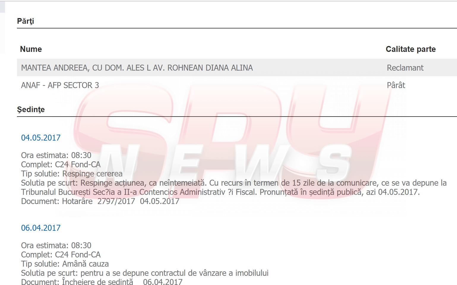 Vedeta TV este dispusă să meargă până în pânzele albe, după ce, în urmă cu doar câteva zile, a pierdut un proces deschis împotriva Administraţiei Finanţelor Publice Sector 3. La termenul de luna trecută, Mantea a fost somată de judecători să demonstreze că a vândut imobilul pentru care a fost taxată de autorităţi, iar la finele săptămânii trecute judecătorii au respins cererea, ca neîntemeiată, urmând ca avocatul vedetei să facă recurs.