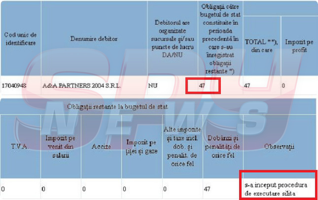 Potrivit listei contribuabililor care înregistrează obligaţii restante la bugetul de stat, deţinută de Agenţia naţională de Administrare Fiscală, una dintre cele trei societăţi comerciale ale vedetei - A&A PARTNERS 2004 S.R.L - va fi executată silit pentru "ameţitoarea" sumă de 47 de lei.