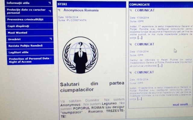 “Vă salutăm Domnilor. Noi suntem Anonymous . Noi suntem Legiunea . Noi suntem POPORUL ROMÂN sau desigur “ciumpalacii”. România, TREZEŞTE-TE!”, au scris hackerii de la Anonymous pe site-ul Poliţiei Române.