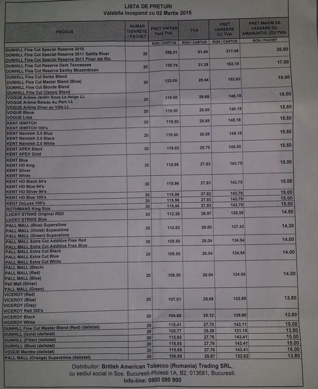 Majorările de preţ sunt de 50 de bani(0,5 lei) pe pachet, iar British American Tobacco este primul producător de pe piaţa locală care majorează preţurile, după ce, de la 1 aprilie, Guvernul a decis să crească acciza la ţigarete.