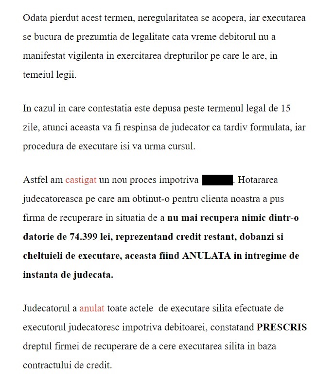 Instanţele bucureştene le-au dat o lovitură sub centură "recuperatorilor" care au încercat să execute silit mai mulţi datornici, considerând că firmele de recuperări creanţe nu au formulat cererile respective în timp util. Anunţul a fost făcut de avocata Iulia Blaja, care a câştigat mai multe procese ale unor clienţi care aveau datorii uriaşe, preluate de o companie de recuperări. Cel mai recent proces viza un client care avea datorii de 75.000 de lei, care au fost "şterse" de judecători. "Legea prevede un termen de trei ani în care firmele de recuperare sau băncile pot trece la executarea silită, în cazul în care clienţii împrumutaţi nu-şi achită obligaţiile de rambursare a împrumuturilor de bunăvoie. Demararea executării peste acest termen este sancţionată cu ANULAREA întregii proceduri de executare. Însă această acţiune nu operează din oficiu. Debitorul executat trebuie să depună contestaţie la executare în care să invoce această încălcare a termenului. Anularea executării în temeiul prescripţiei dreptului la executare silită poate fi solicitată doar în termen de 15 zile de la data la care debitorul a luat la cunoştinţă de începerea executării. Această dată este ziua în care debitorul primeşte acasă, de la un executor judecătoresc, înştiinţarea privind începerea executării, fie ziua în care află de poprirea disponibilităţilor din conturile bancare ori ziua în care află de poprirea salariului", a explicat avocata, pe site-ul iuliablaja.ro.