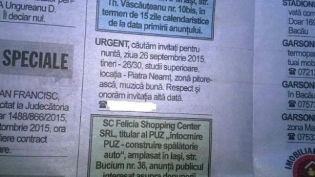 “Urgent, căutăm invitaţi pentru nuntă, ziua 26 septembrie 2015, tineri 26/30, studii superioare, locaţia - Piatra Neamţ, zonă pitorească, muzică bună”, se arată în anunţ.