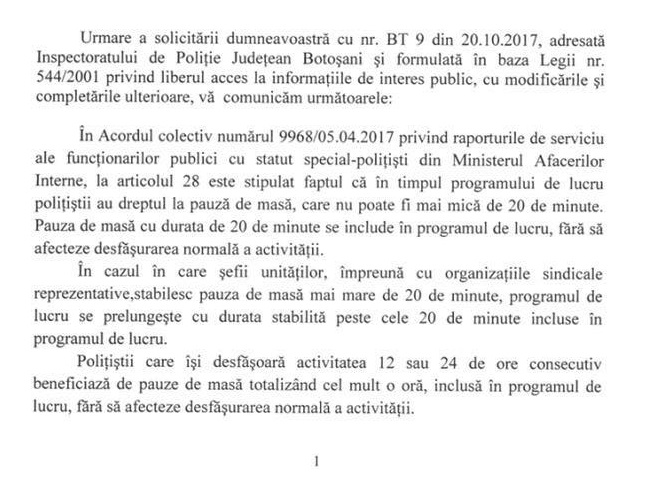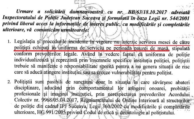 După ce zeci de poliţişti din întreaga ţară s-au declarat indignaţi pentru că au fost mustraţi sau sancţionaţi de şefi fiindcă au fost văzuţi mâncând în diferite localuri, în pauza de masă, purtând "haina statuluI", un sindicat al oamenilor legii a făcut public răspunsul oficial al unor şefi de inspectorate. "Deci, dragi colegi, zice-se că putem servi masa chiar și în uniforma de serviciu, așa cum este și normal, în orice unitate de alimentație publică - restaurant, fără a ne ascunde prin separeuri sau locuri insalubre de frica faptului că am putea fi văzuți... mâncând. Pe de altă parte, da, am ajuns să ne bucurăm că ne este respectat un drept fundamental, acela de a ne alimenta. Trist, dar adevărat", a fost mesajul unui reprezentant al sindicatului.
