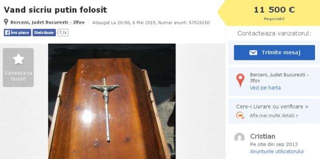 Un anunţ postat pe un site de publicitate a devenit viral pe internet. Un bărbat pe nume Cristian oferă spre vânzare un „sicriu puţin folosit” la un preţ negociabil de 11.500 de euro.