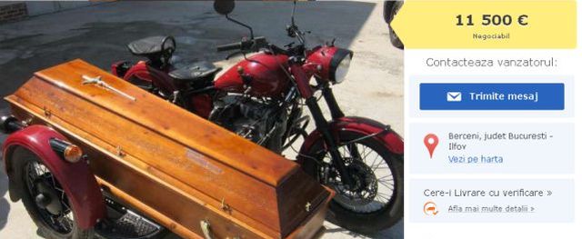 Cristian a postat un anunţ prin care vinde un sicriu şi o motocicletă de colecţie, fabricată în 2012. „Vând sicriu puţin folosit, lemn de brad lăcuit. Stare bună, prezintă uşoare urme de uzură normală, zgârieturi şi perforaţii, nimic grav. La interior lipseşte pânza, perna şi ocupantul. Dimensiuni: 200 x 80 cm. Accesorizat cu un frumos crucifix din plastic aurit, 4 mânere de asemenea din plastic aurit, 8 şuruburi de fixare cu capac în formă de cruce (plastic aurit), precum şi o motocicletă Ural Retro, an fabricatie 2012, 9.000 km, culoare roşie stare ca nouă. Preţ: 11.500 de euro, negociabil”, este anunţul postat pe un site de mică publicitate.