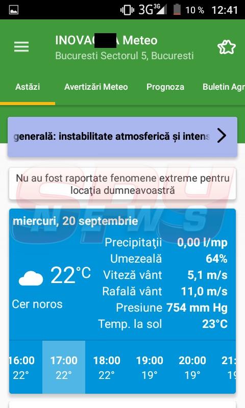 Pe de altă parte, ANM a emis cod galben pentru Capitală, iar alte aplicaţii (gratuite, nu pe bani, ca cea recomandată de autorităţi) avertizează că urmează o furtună puternică.