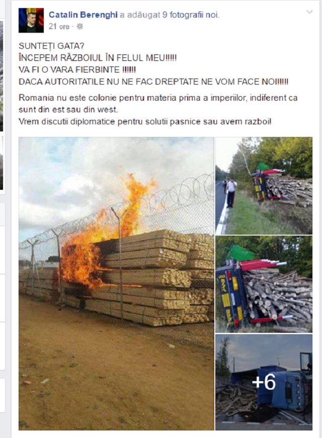 Dacă plantarea crucilor şi spurcarea cu cadavre de porci a terenului pe care urmează să se construiască mega-moscheea din Bucureşti erau nişte acţiuni aparent inofensive, ieri, Cătălin Berenghi, lansat un mesaj extrem de îngrijorător. "Sunteţi gata? Începem războiul în felul meu! Va fi o vară fierbinte! Dacă autorităţile nu ne fac dreptate, ne vom face noi! România nu este colonie pentru materia primă a imperiilor, indiferent să sunt din est sau din vest!", a scris Berenghi pe Internet, postând nişte imagini extrem de sugestive, cu depozite de cherestea incendiate.