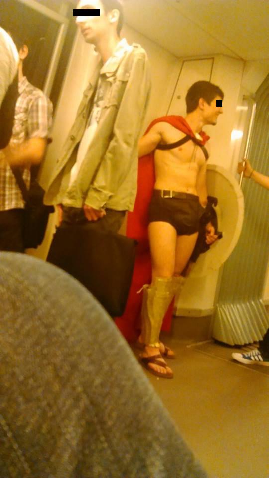Băiatul, îndrăgostit probabil de filmele cu spartani, şi-a făcut apariţia într-o ţinuta de luptător, în plină zi, într-un metrou din Bucureşti. Deşi lumea parea să-l ignore, el râdea cu gura până la urechi şi parea că poartă o discuţie cu cineva. Fotografia inedită cu tânărul excentric a ajuns imediat pe internet.