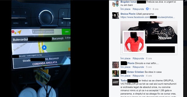 Acest lucru l-a scos din minţi pe taximetristul "trădat", care, pentru a o pedepsi pe tânără, i-a postat pe Facebook adresa la care locuieşte aceasta. Zeci de taximetrişti au înjurat-o pe tânără ca la uşa cortului, iar unul dintre ei, mai "isteţ", a făcut publice şi imagini cu "tupeista", explicându-le colegilor de breaslă că "Ea e panarama", pentru ca tânăra să fie luată cu asalt de "nemulţumiţi".