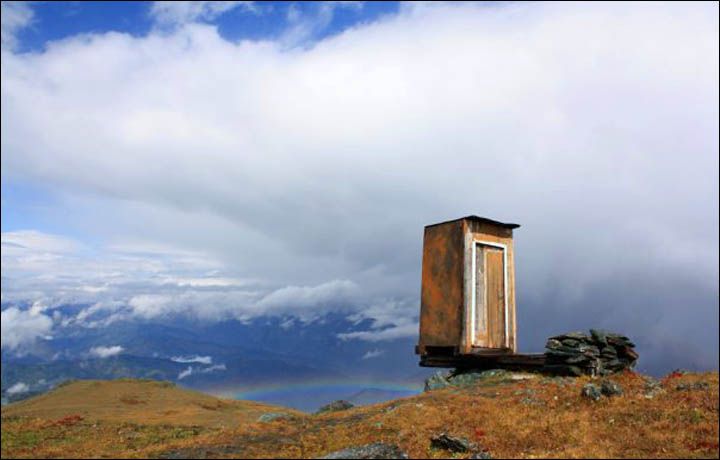 Crezi că ai curaj să mergi la...toaletă? Îţi spunem doar atât: e situată la 2.600 de metri altitudine, pe marginea unei stânci.