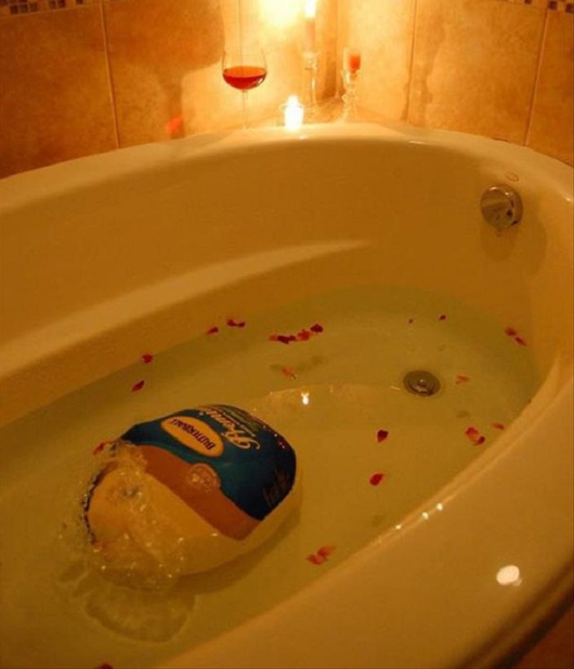 Curcanul, care nu poate lipsi din meniul de Ziua Recunoştinţei, era congelat şi femeia nu mai avea timp să aştepte ca el să se dezgheţe în mod natural. Pentru că nu găsea nicio altă soluţie, a renunţat ea la baia fierbinte pe care şi-o pregătise şi a pus curcanul îngheţat în cada plină cu petale de flori frumos mirositoare. Gospodina a vrut ca isprava sa să ajungă viral pe Internet, aşa că i-a făcut o poză curcanului în acel decor romantic şi a publicat-o pe contul de Facebook.