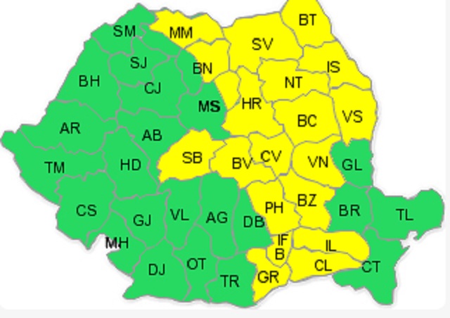 Administraţia Naţională de Meteorologie a emis o atenţionare cod galben de instabilitate atmosferică pentru 20 de judeţele şi municipiul Bucureşti.
