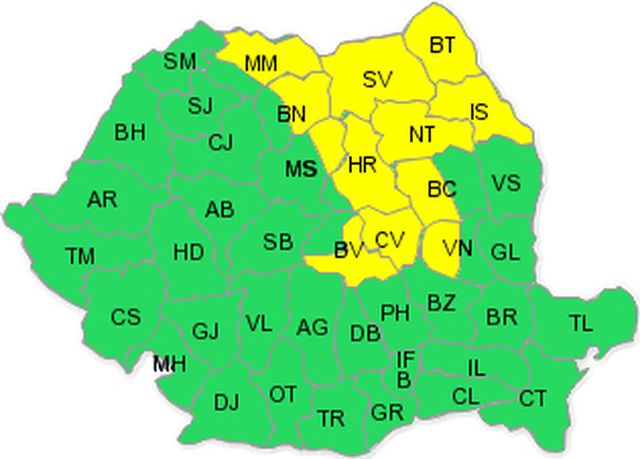 Administraţia Naţională de Meteorologie a emis o avertizare cod galben de ploi însemnate cantitativ, valabilă de vineri de la ora 03.00 până sâmbătă la ora 08.00 în 12 judeţe din ţară, din zona de nord-est şi centrală a ţării. În zona de munte va ninge.