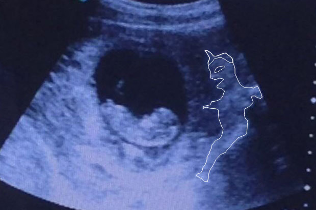Pe filmul de la ecografie, în partea dreaptă a capului fătului se poate desluşi silueta unei forme ce seamănă cu desenele reprezentative pentru Diavol.