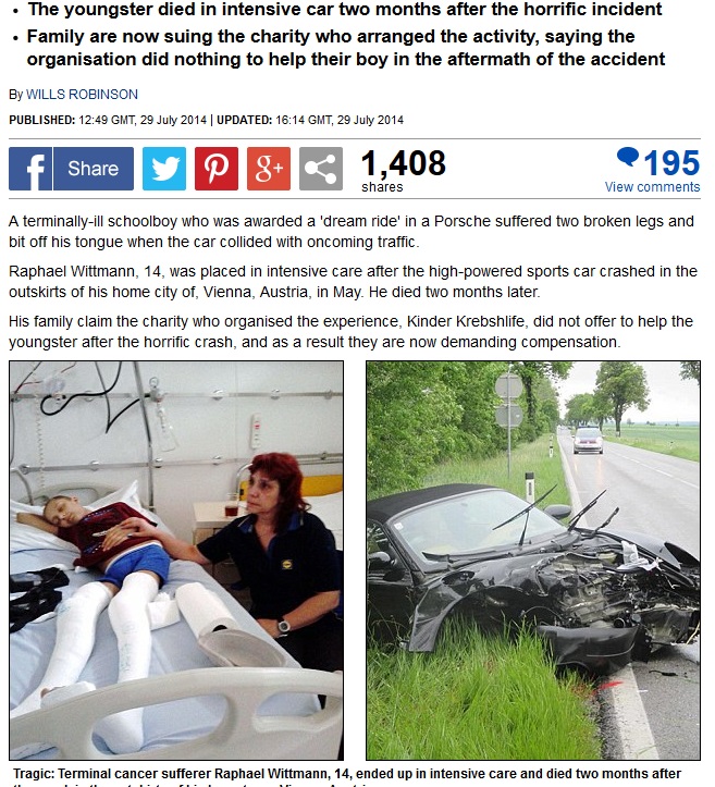 Părinţii adolescentului au acceptat să-i îndeplinească ultima dorinţă a băaitului de a lua parte la o cursă de maşini, chiar în timpul unui eveniment caritabil de strângere de fonduri. Aceştia nu şi-au imaginat nicio secundă că aceasta va fi ultimul drum al băiatului, care a ajuns să fie victima unui accident îngrozitor în urma căruia şi-a pierdut viaţa.