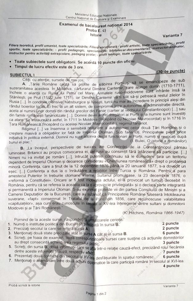 BACALAUREAT 2014, sesiunea toamnă / Subiectele de la ISTORIE