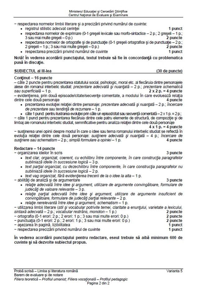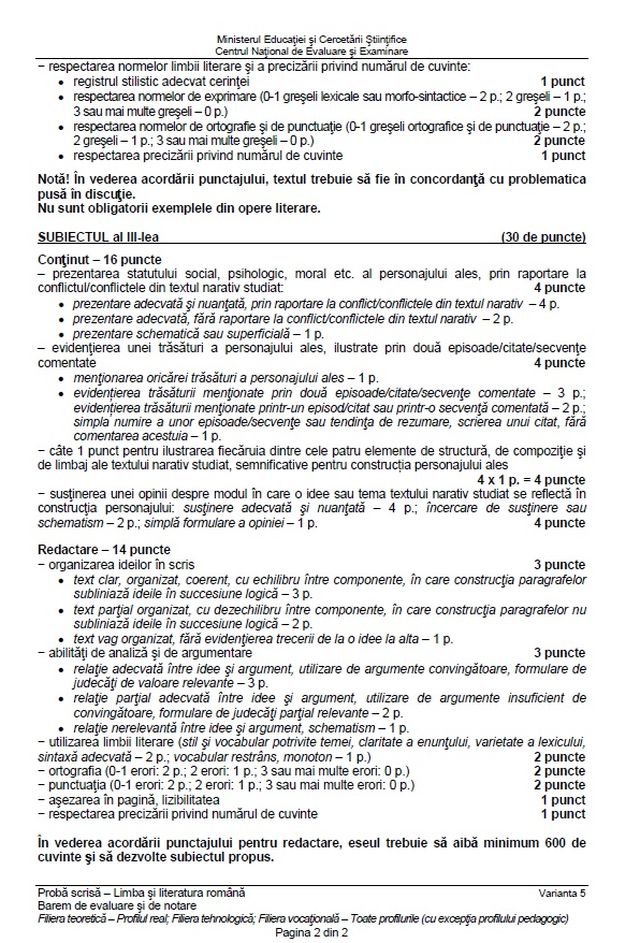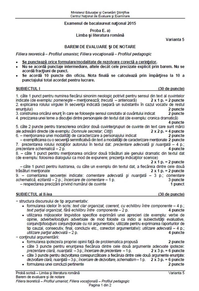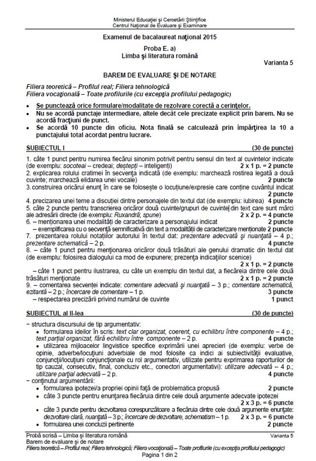 BACALAUREAT 2015. Iată baremul la proba scrisă la Limba şi Literatură Română, la Bacalaureat 2015:
