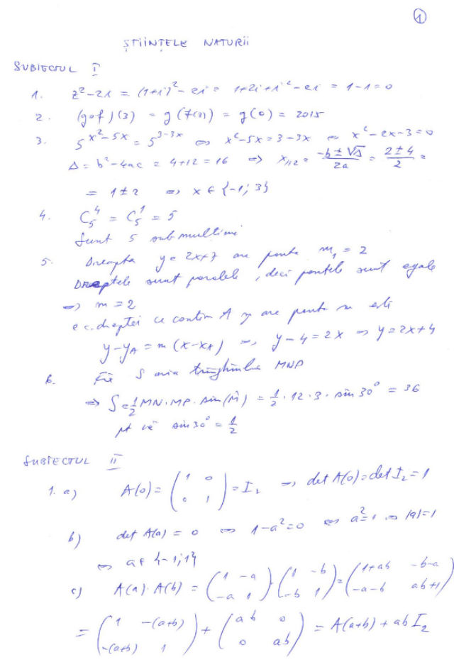 REZOLBARE SUBIECTE MATEMATICĂ BACALAUREAT 2015, la Ştiinţele Naturii