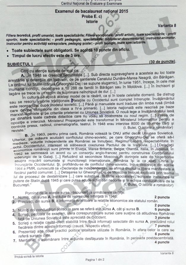 BACALAUREAT 2015. Subiectele date la istorie au fost publicate