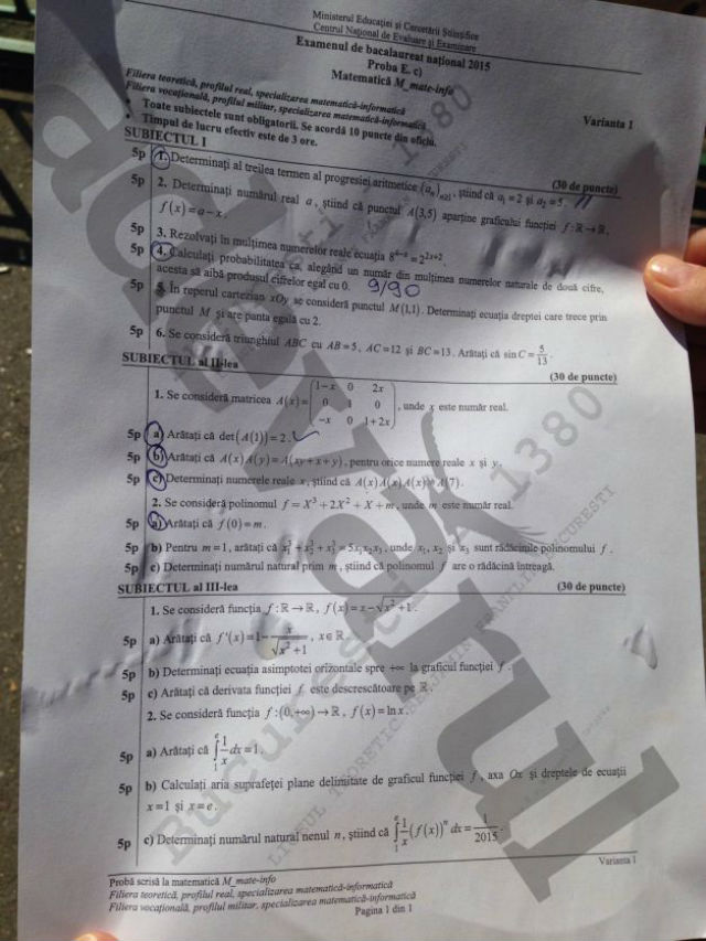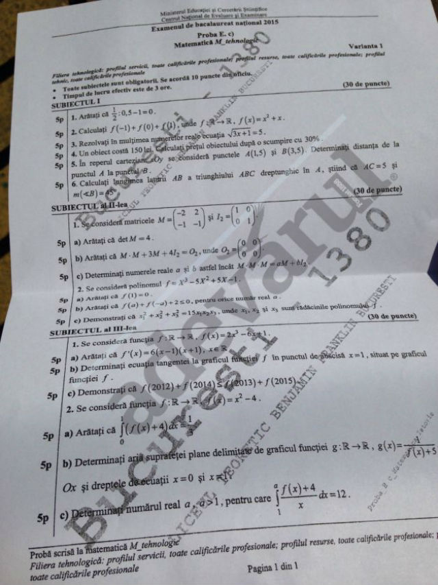 Bacalaureat 2015. Mai jos găseşti subiectele pe care astăzi zeci de mii de elevi au trebuit să le rezolve pentru a promova examenul. Fiecare probă are trei subiecte.