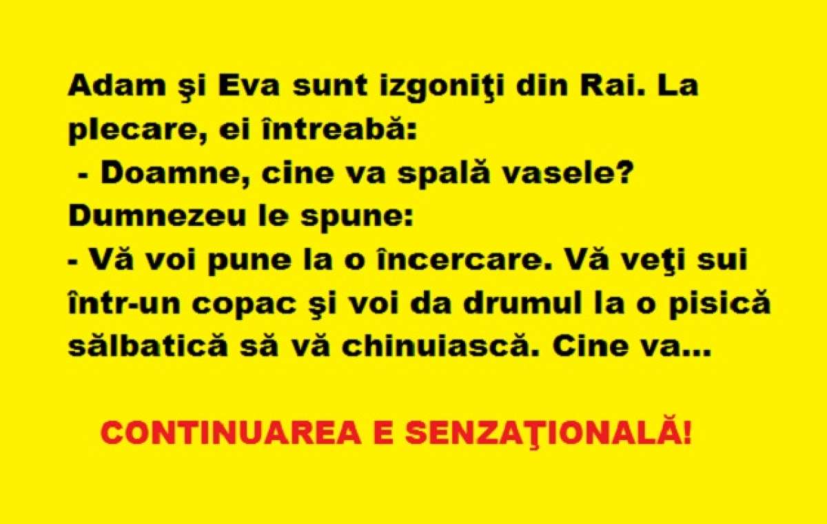 Bancul zilei: Adam şi Eva sunt izgoniţi din Rai. La plecare, ei...