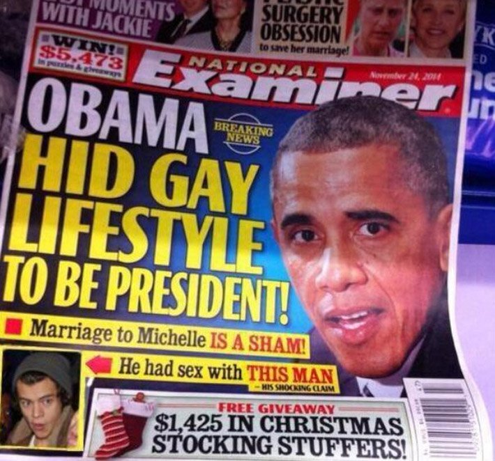 Ipoteză şocantă lansată de un tabloid american! Prima pagină a publicaţiei National Examiner susţine că mariajul lui Obama cu Michelle este "o ruşine" cu ajutorul căruia preşedintele american "îşi maschează viaţa de gay", pentru a putea fi preşedinte, potrivit attitude.co.uk.