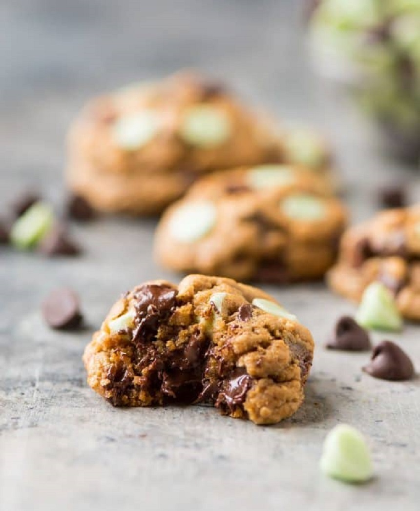 Într-un bol mare, se adaugă untul, iaurtul, zahărul brun şi zahărul granulat. Se mixează, la viteză medie, timp de aproximativ patru minute, până ce compoziţia devine pufoasă. Apoi se adaugă oul şi esenţa de vanilie şi se amestecă până ce acestea se integrează complet. Se adaugă bicarbonatul şi făina se mixează, la videză scăzută, până când aceasta se integrează complet şi aluatul capătă consistenţa dorită. La final se adaugă chipsurile de ciocolată şi dropsurile de mentă şi se amestecă cu o spatulă. Se introduce amestecul la frigider timp de aproximativ o oră.