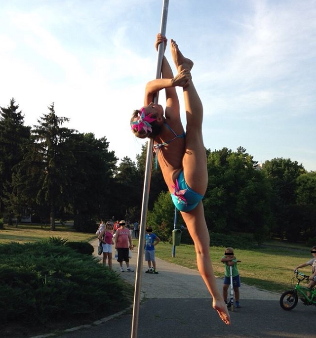 Nadia Buduruşi, sportiva de 34 de ani care în urmă cu doi ani făcea furori la emisiunea "România dansează", de la Antena 1, iar acum a ajuns în semifinala unui concurs de talente, nu face show doar pe scenă. Ci şi pe stradă. Acrobata a fost surprinsă, de mai multe ori, în timp ce se dădea în spectacol în public, folosind pe post de bară ţevile indicatoarelor rutiere din Capitală. Vizibil surprinşi de schemele senzuale ale acrobatei, trecătorii s-au oprit în loc şi au admirat spectacolul ad-hoc, unii dintre aceştia reuşind să şi imortalizeze show-ul inedit.