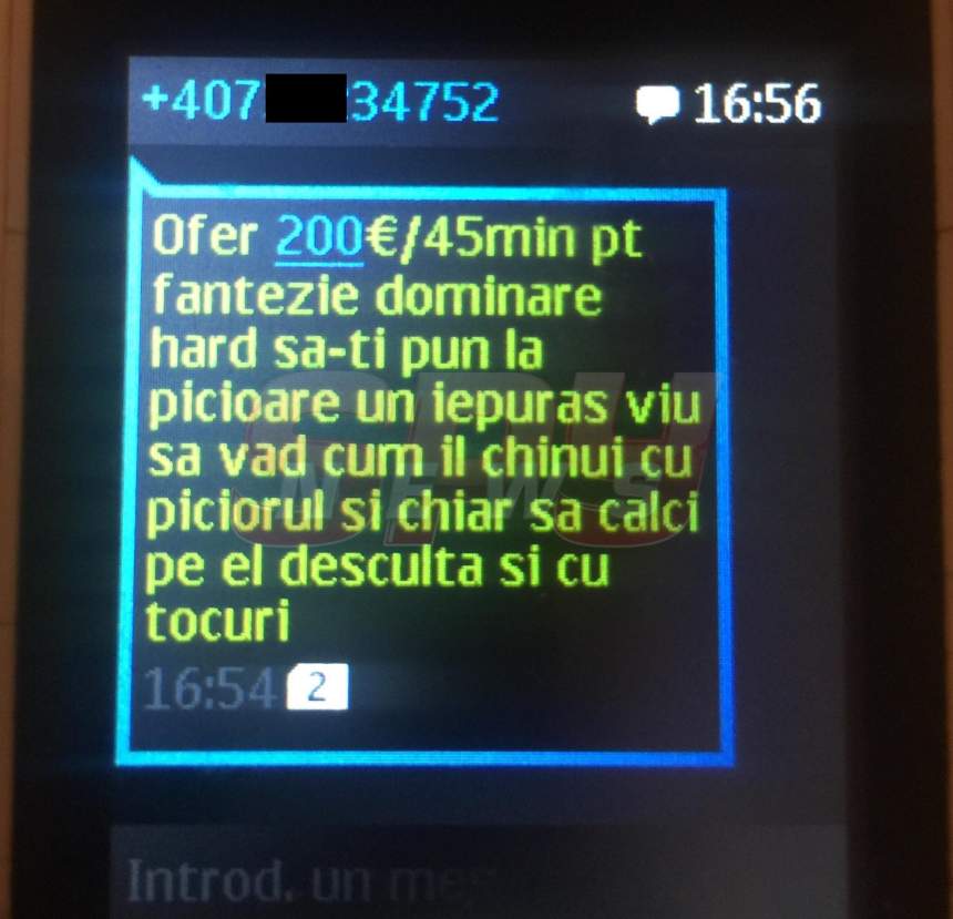 Tânăra care a primit mesajul terifiant a povestit că a rămas mască în momentul în care a văzut conţinutul SMS-ului. "Ofer 200 de euro / 45 de minunte pentru fantezie dominare hard, să-ţi pun la picioare un iepuraş viu, să văd cum îl chinui cu piciorul şi chiar să calci pe el desculţă şi cu tocuri" – a fost oferta individului.