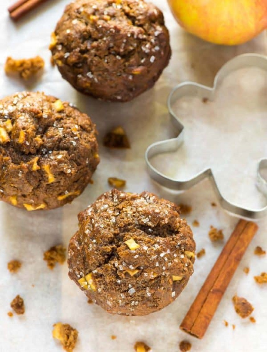 Se preîncălzeşte cuptorul la o temperatură de 170 de grade şi se tapetează cu un spray pentru gătit o tavă de copt pentru brioşe. Într-un castron mic, se încălzeşte uleiul de cocos, în cuptorul cu microunde şi se lasă deoparte. Într-un bol mare, se combină iaurtul, laptele, zahărul brun şi oul. Se mixează până ce toate ingredientele se combină, apoi se adaugă uleiul de nucă de cocos. Într-un alt vas, se combină făina, bicarbonatul de sodiu, ghimbirul, scorţişoara, sarea şi cuişoarele. Se combină amestecul de făină cu cel de ulei de cocos şi se frământă cu mâna până ce se obţine un aluat omogen. La final se adaugă cubuleţele de măr şi se amestecă până ce acestea se integrează complet. Se pune aluatul, în tava pentru brioşe, în mod egal, şi se introduce la cuptor. Se coc timp de 16-18 minute. La final se lasă timp de cinci minute să se răcească după care se scot brioşele din tavă. Se servesc imediat.