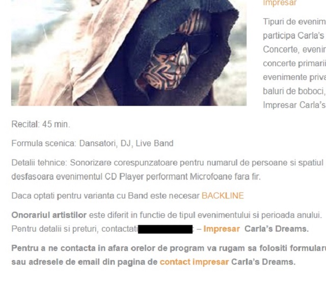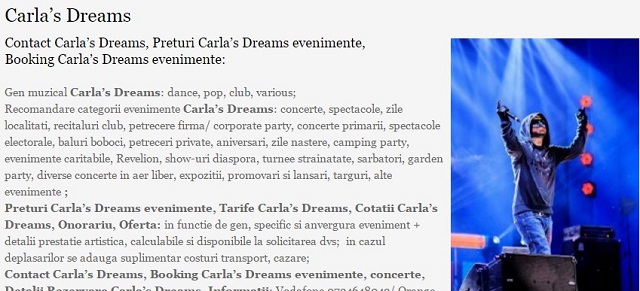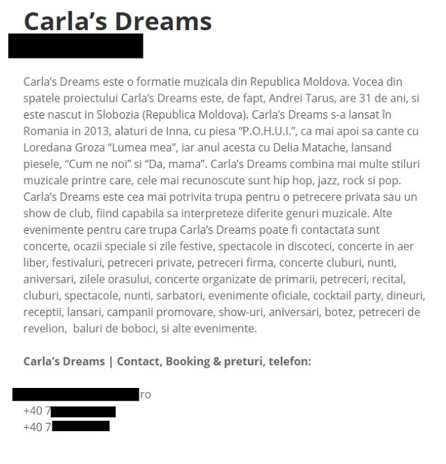 Considerată una dintre cele mai bine cotate trupe din România, Carla's Dreams a devenit o maşinărie de făcut bani pentru mai multe site-uri, unde diverşi impresari susţin că ei sunt cei care îi reprezintă pe artiştii de dincolo de Prut. Numele Carla's Dreams a apărut, recent, pe mai multe pagini web, unde diverşi impresari lasă să se înţeleagă faptul că ei ar fi singurii care pot intermedia contracte cu basarabenii, pentru diferite ocazii. Fie că este vorba despre baluri ale bobocilor, fie de petreceri private sau de concerte în cluburi, afaceriştii care au simţit mirosul banilor au menţionat, pe site-urile respective, la rubrica "Impresar", propriile numere de telefon. Însă, conform casei de discuri care îi reprezintă, exclusiv, pe artişti, respectivii nu sunt decât nişte intermediari.
