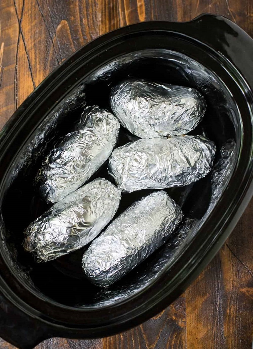 Se spală cartofii sub un jet de apă rece, iar după ce s-au uscat, se înteapă fiecare cu furculiţa şi se asezonează cu sare şi ulei de măsline, apoi se împachetază în folie de aluminiu. Se aşează într-o tavă de copt şi se introduc în cuptor. Se gătesc timp de aproximativ 30 de minute, la o temperatură de 190 de grade.