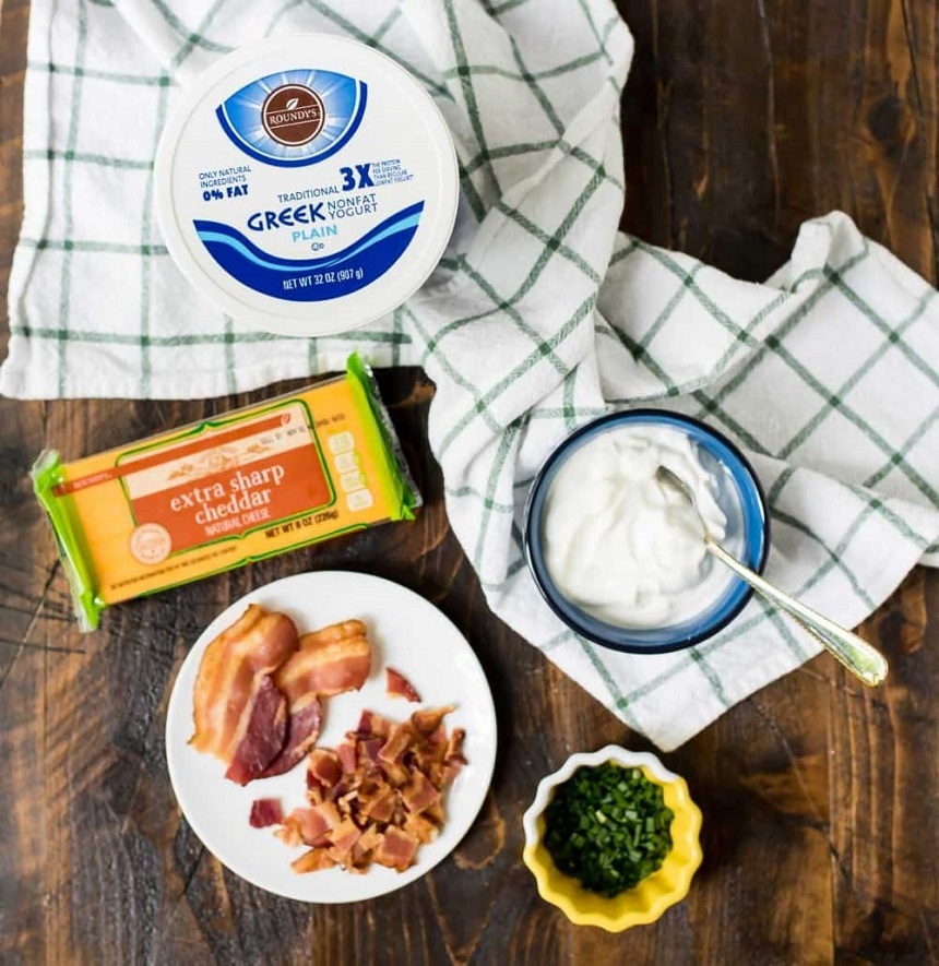 După ce cartofii sunt gata, se despachetează din folia de aluminiu, se taie pe jumătate, iar apoi se garnisesc cu bacon prăjit, ceapă verde, iaurt şi brânză Cheddar. Se servesc imediat.