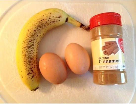 Pasăm banana şi apoi amestecăm cu cele două ouă şi scorţişoara.